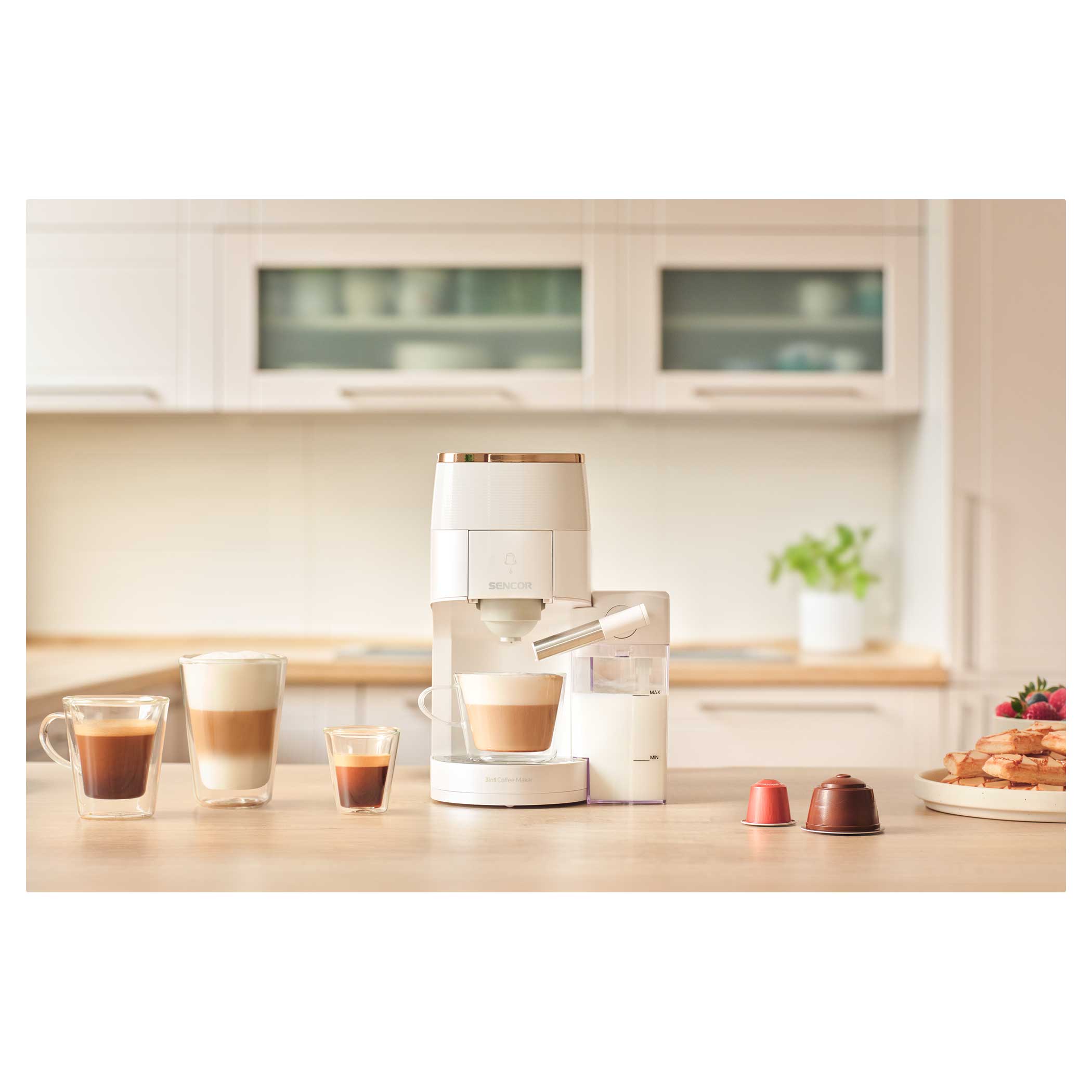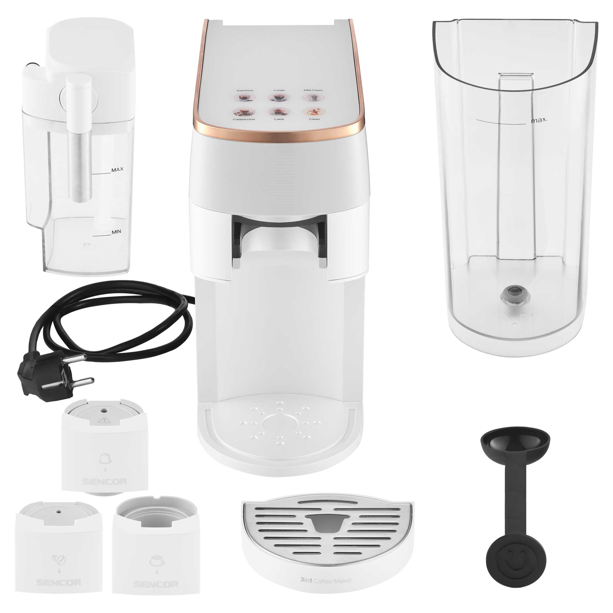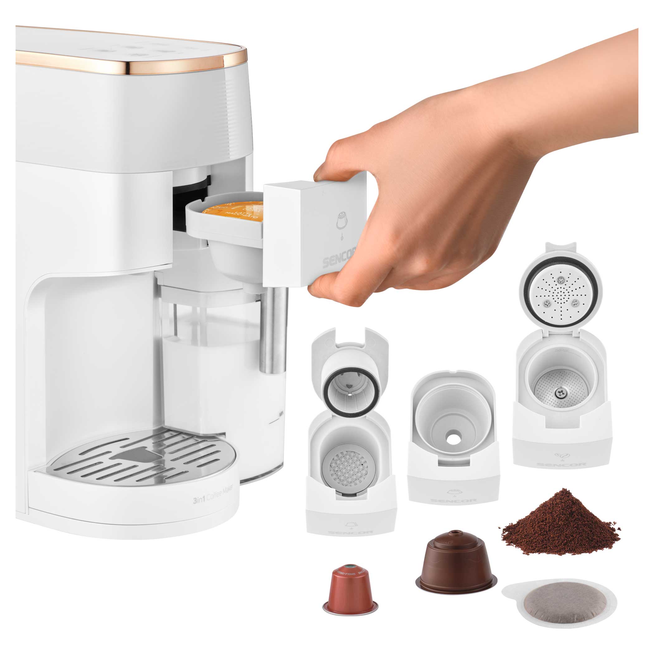 Odkryj nieskończone możliwości w przygotowywaniu kawy dzięki wielokapsułkowemu ekspresowi do kawy Sencor SCC 3000BK, który przygotuje pyszną kawę łatwo, szybko i z wysoką jakością. Wybieraj spośród szerokiej gamy kapsułek Nespresso® Original*, Nescafé® Dolce Gusto®* lub dowolnej marki mielonych ziaren, w zależności od preferencji. Kolorowy wyświetlacz ułatwia wybór ulubionego napoju jednym dotknięciem. Profesjonalna jakość jest wspierana przez wydajną pompę o ciśnieniu 19 barów i system podgrzewania wody Thermoblock. Ekspres jest wyposażony w zbiornik na mleko do automatycznego spieniania mleka i łatwego czyszczenia dzięki automatycznemu płukaniu. Ze względu na kompaktowe rozmiary można go również kupić do mniejszych mieszkań.