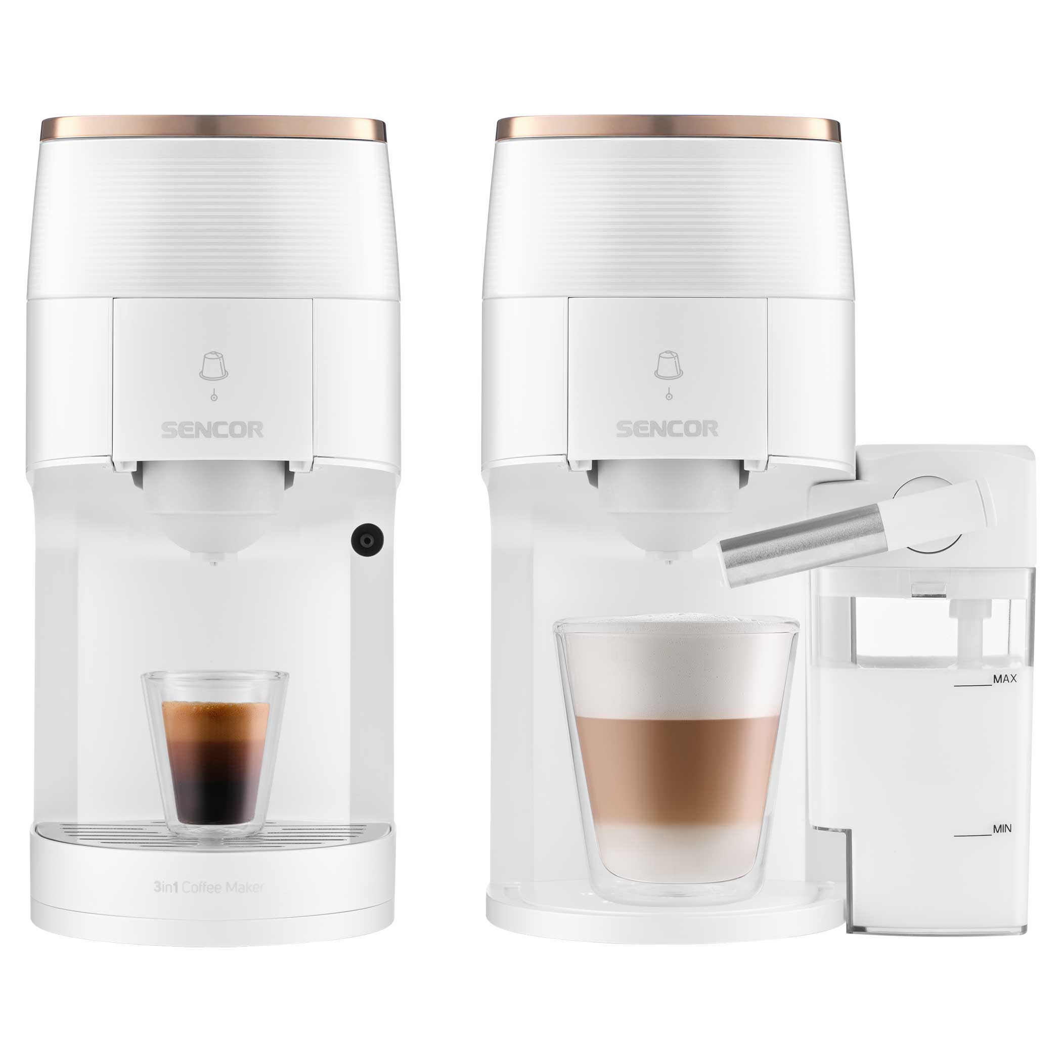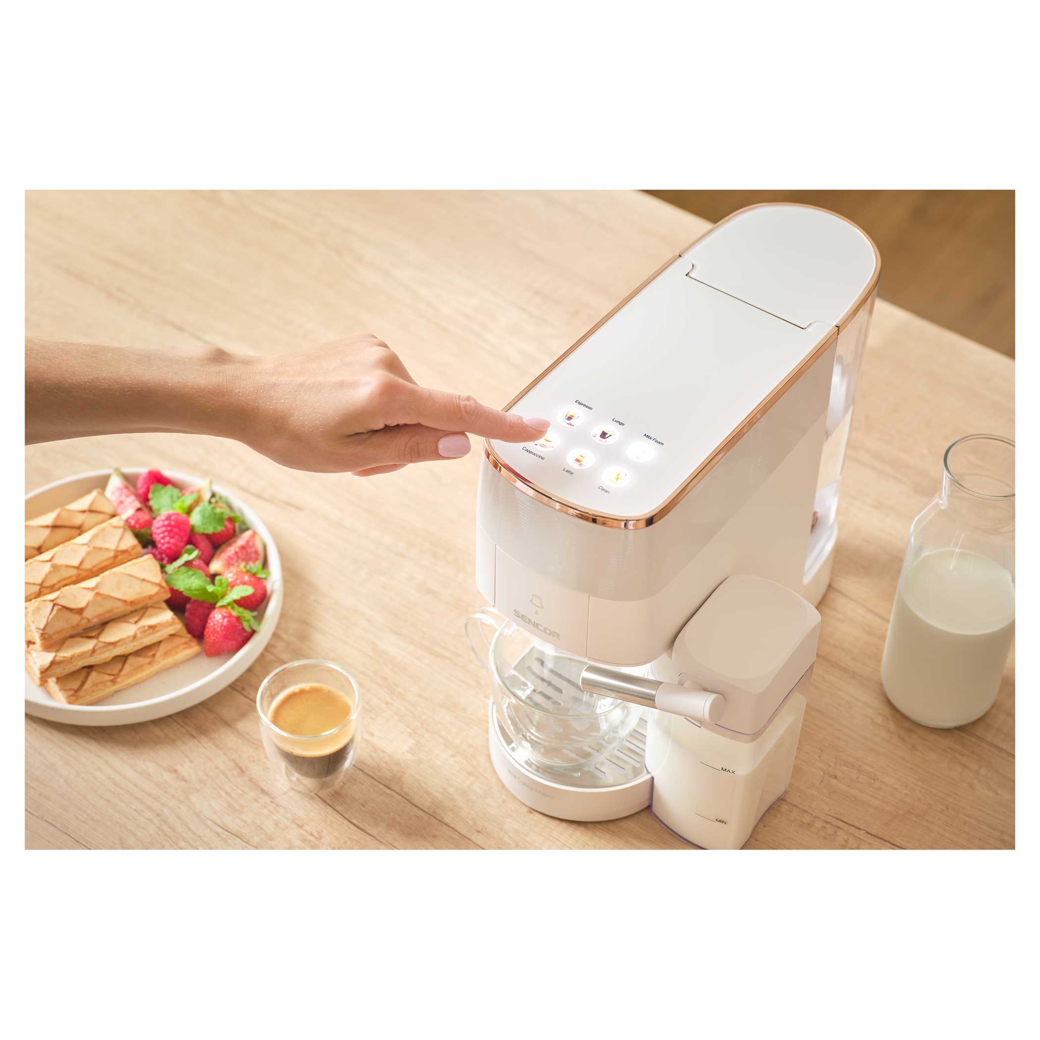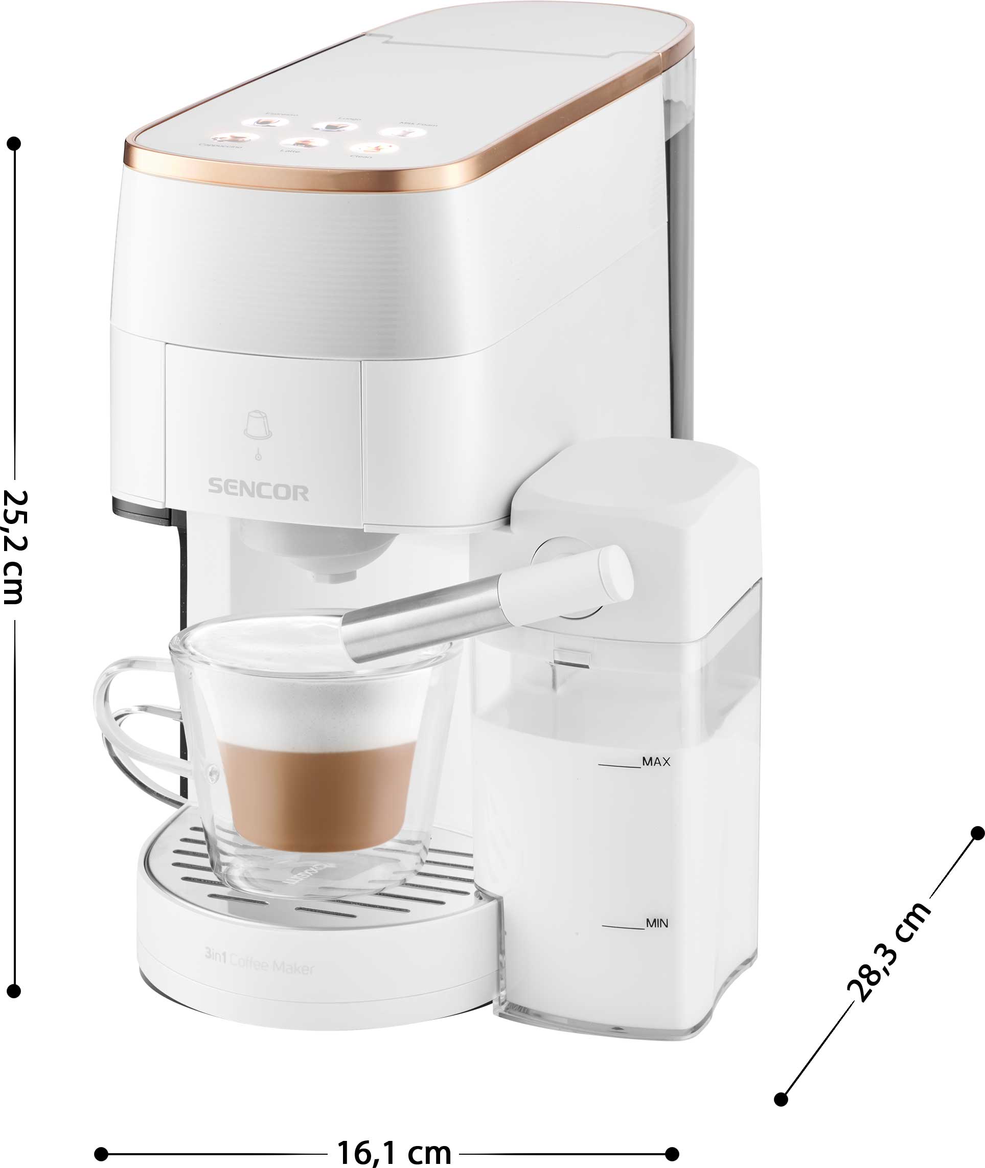 Odkryj nieskończone możliwości w przygotowywaniu kawy dzięki wielokapsułkowemu ekspresowi do kawy Sencor SCC 3000BK, który przygotuje pyszną kawę łatwo, szybko i z wysoką jakością. Wybieraj spośród szerokiej gamy kapsułek Nespresso® Original*, Nescafé® Dolce Gusto®* lub dowolnej marki mielonych ziaren, w zależności od preferencji. Kolorowy wyświetlacz ułatwia wybór ulubionego napoju jednym dotknięciem. Profesjonalna jakość jest wspierana przez wydajną pompę o ciśnieniu 19 barów i system podgrzewania wody Thermoblock. Ekspres jest wyposażony w zbiornik na mleko do automatycznego spieniania mleka i łatwego czyszczenia dzięki automatycznemu płukaniu. Ze względu na kompaktowe rozmiary można go również kupić do mniejszych mieszkań.
