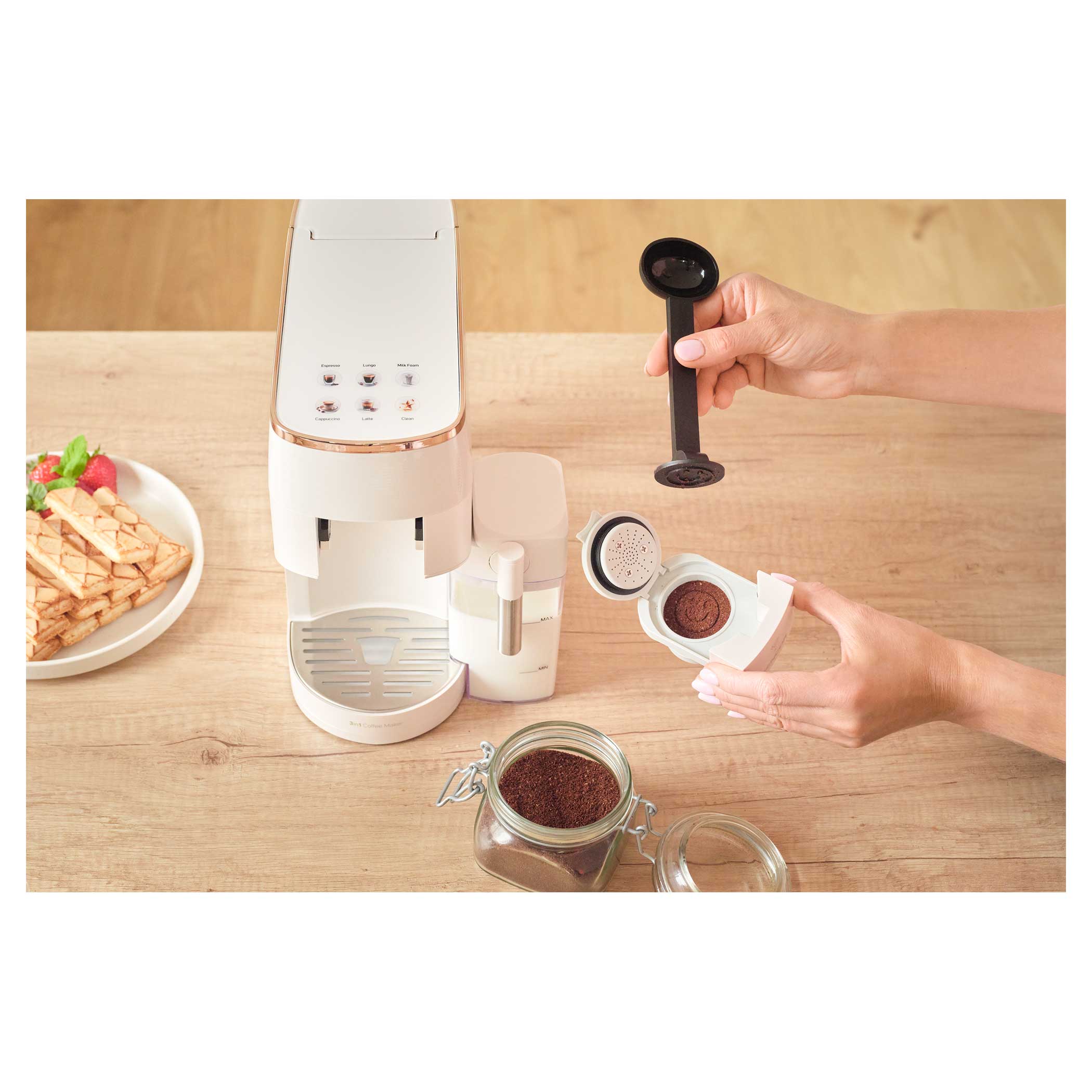 - na kapsułki Nespresso® Original*, Nescafé® Dolce Gusto®* lub mielone ziarna kawy