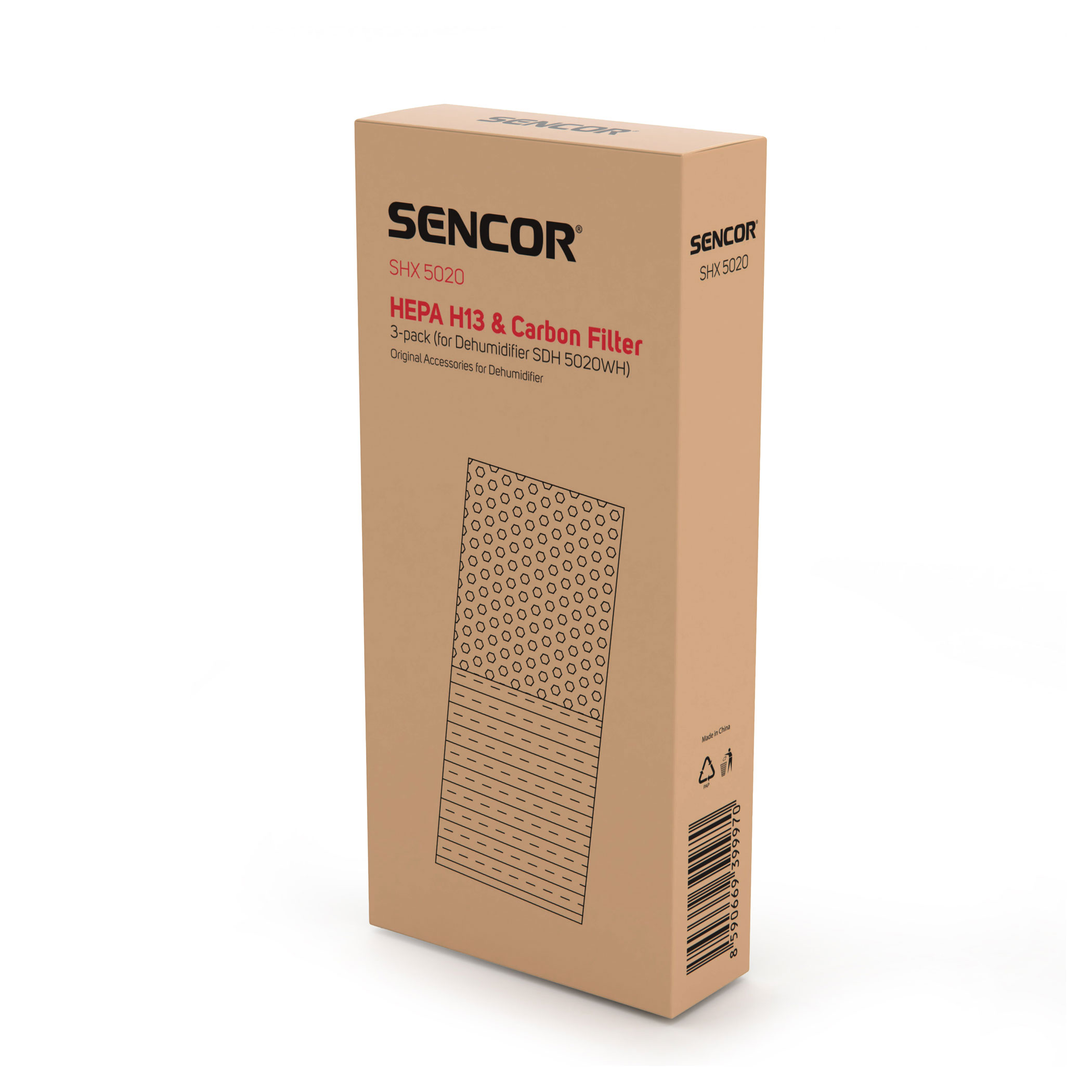Opakowanie zawiera 3 sztuki filtra SHX 5020 HEPA H13 z węglem aktywnym do mobilnego osuszacza powietrza Sencor SDH 5020WH PumpIt 50l Wi-Fi.