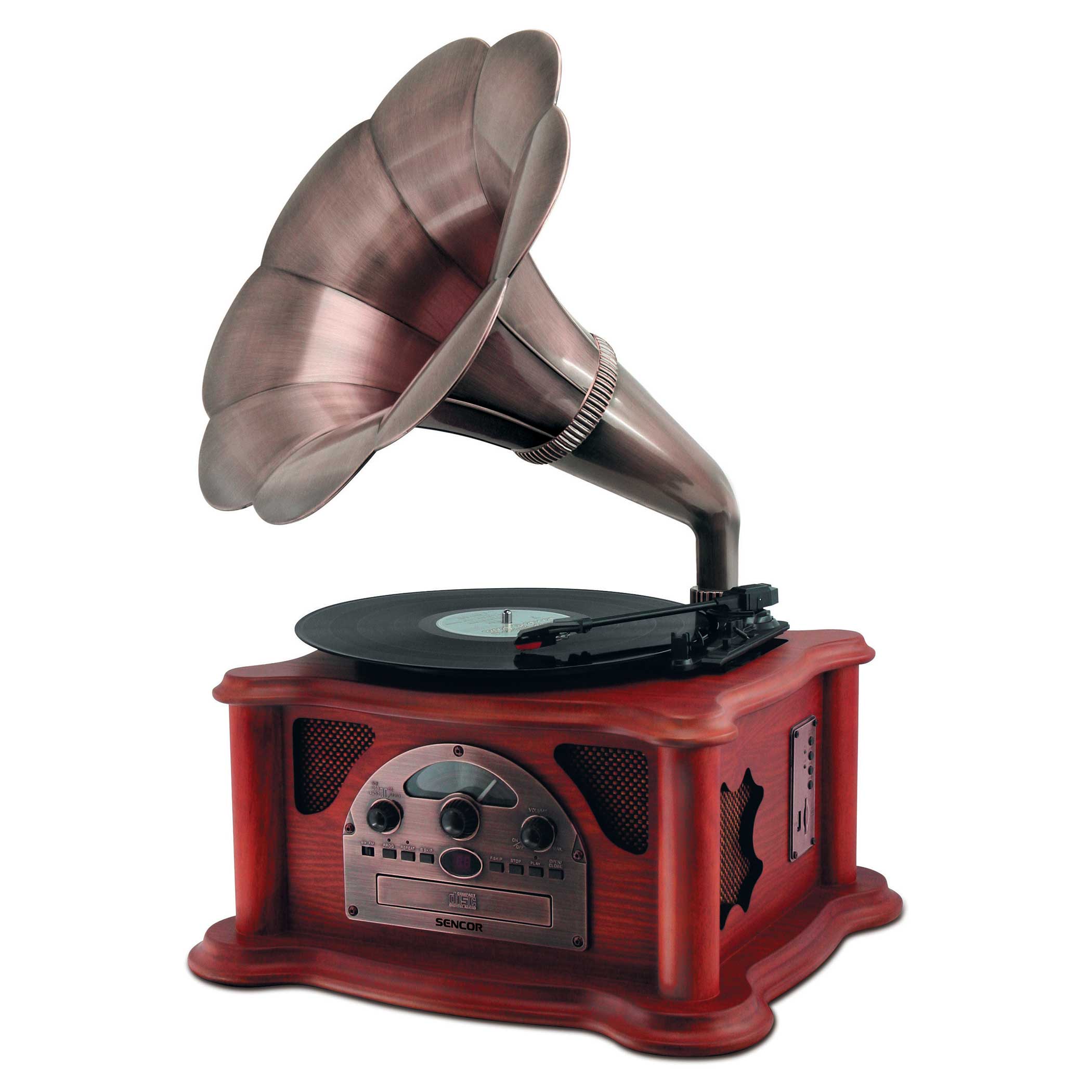 - Gramofon z tubą oraz funkcją auto stop