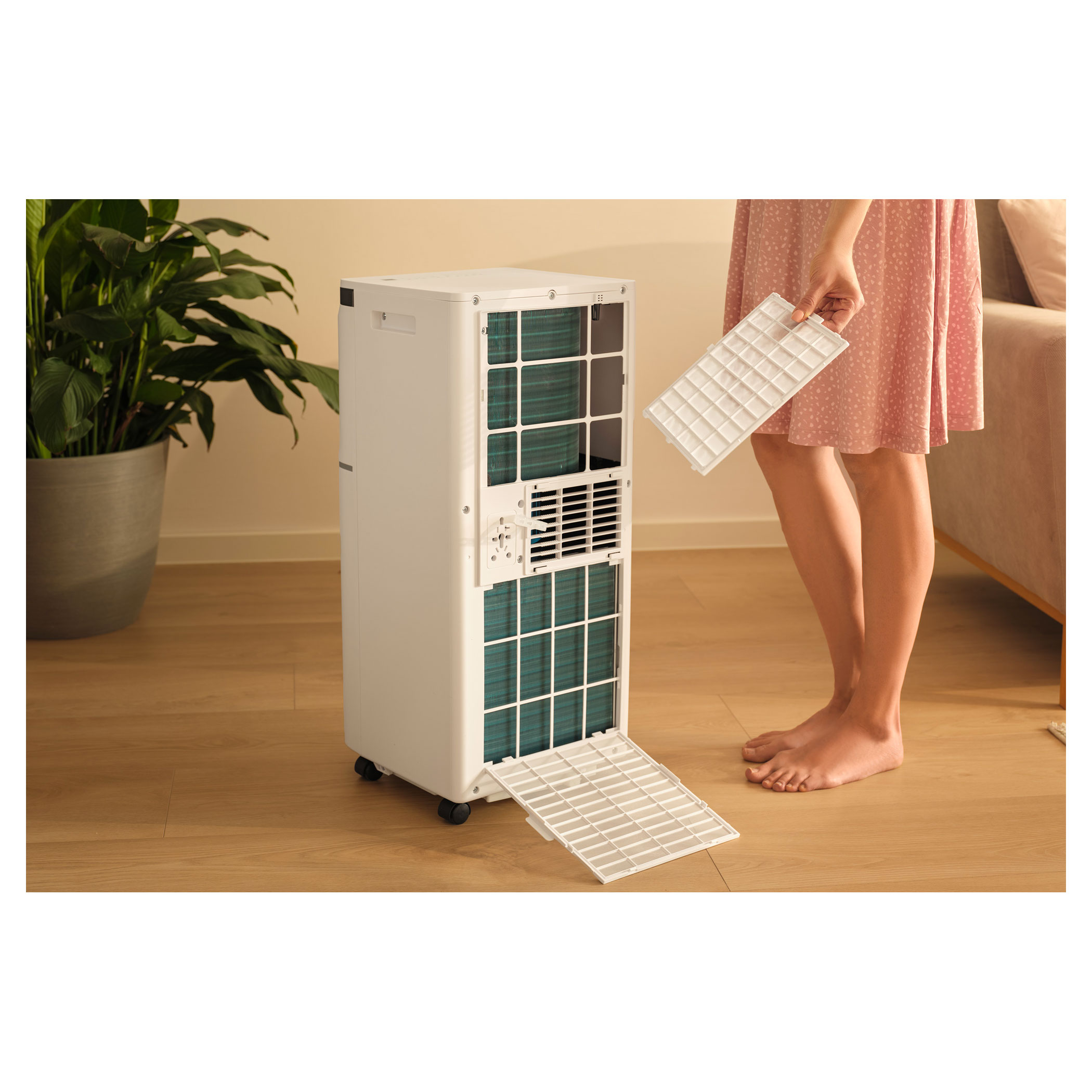 - Łatwy do czyszczenia filtr powietrza eliminuje wirowanie kurzu i filtruje zanieczyszczenia mechaniczne, przedłużając żywotność klimatyzatora i zapobiegając zatykaniu się klimatyzatora, które prowadziłoby do obniżenia wydajności
