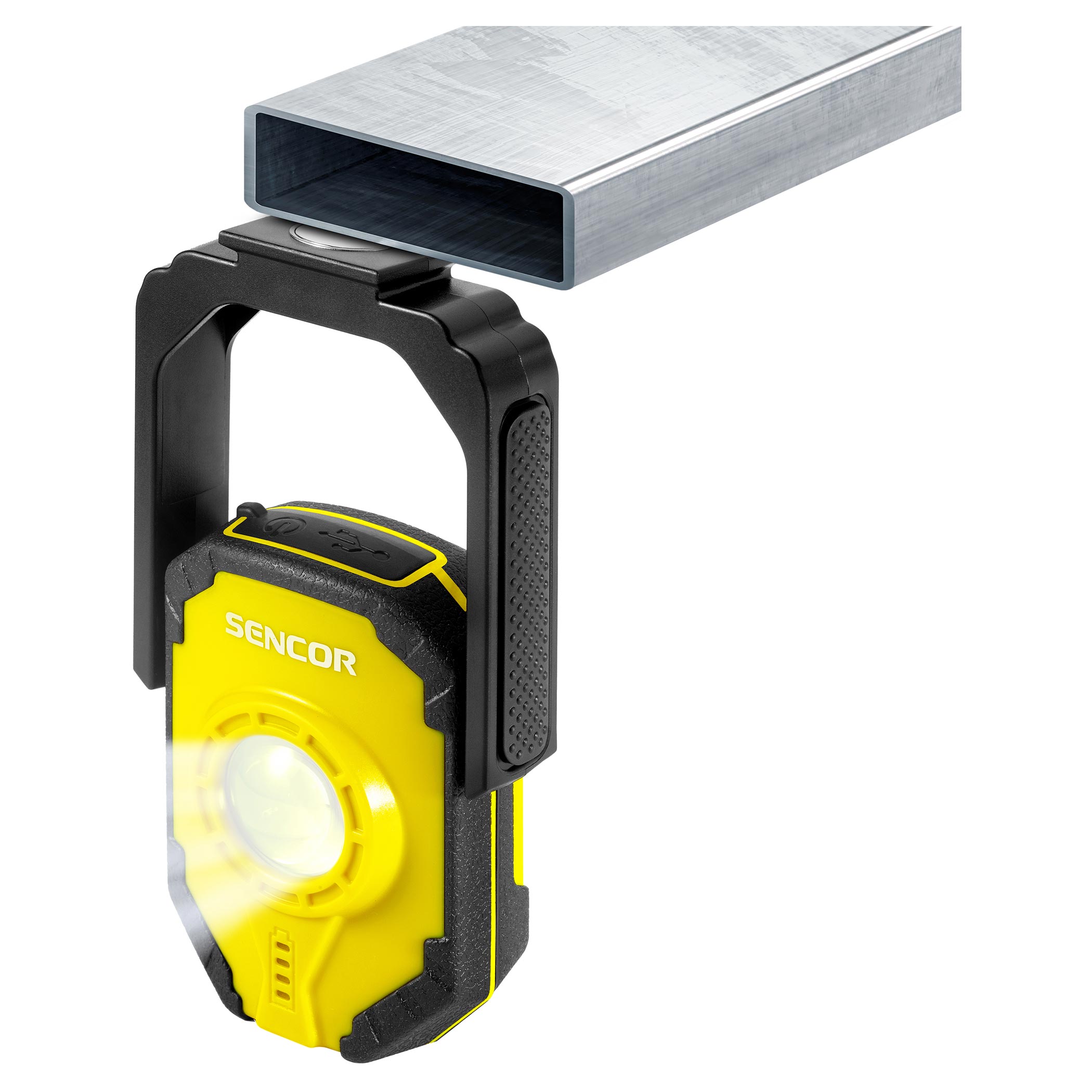 Mocna latarka robocza z funkcją power banku. Zawiera uchwyt z silnym magnesem, dzięki któremu można przyczepić latarkę wszędzie tam, gdzie jest potrzebna.