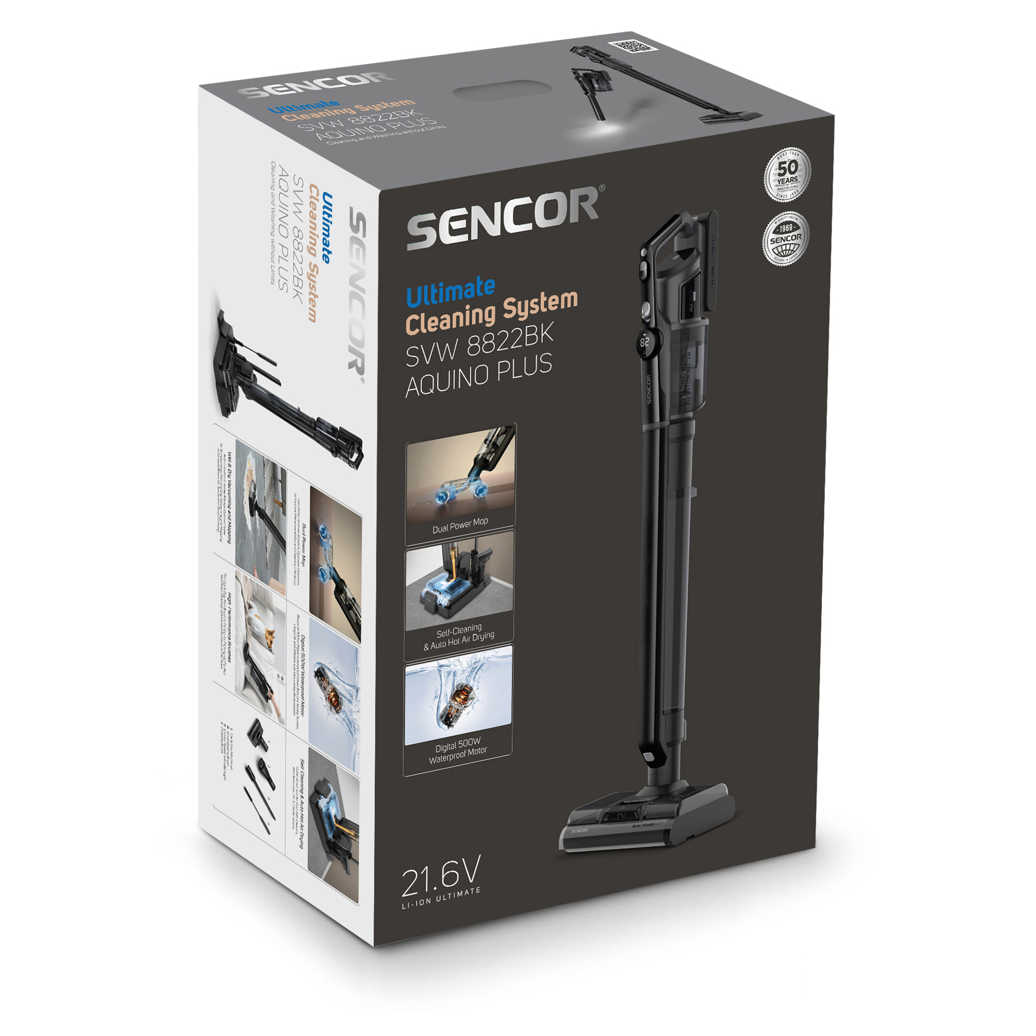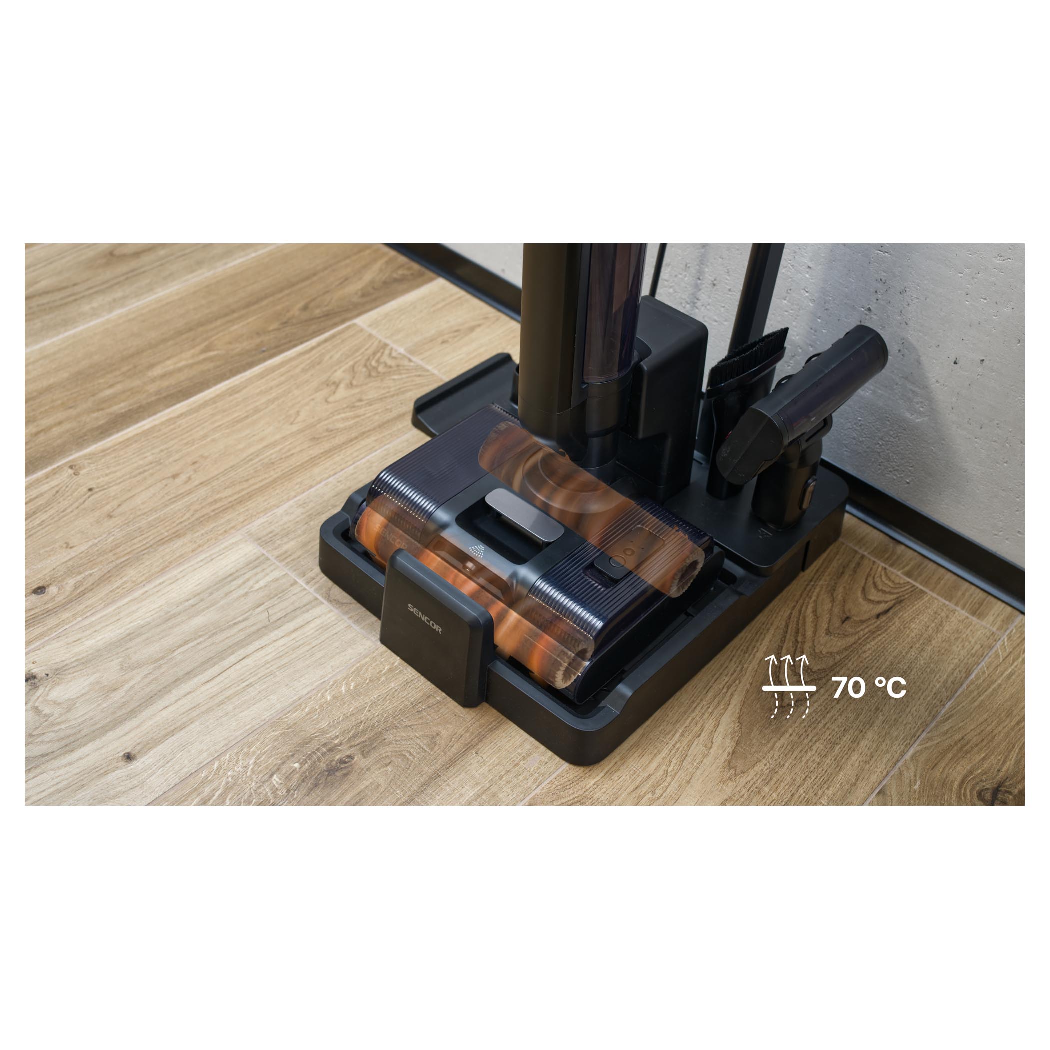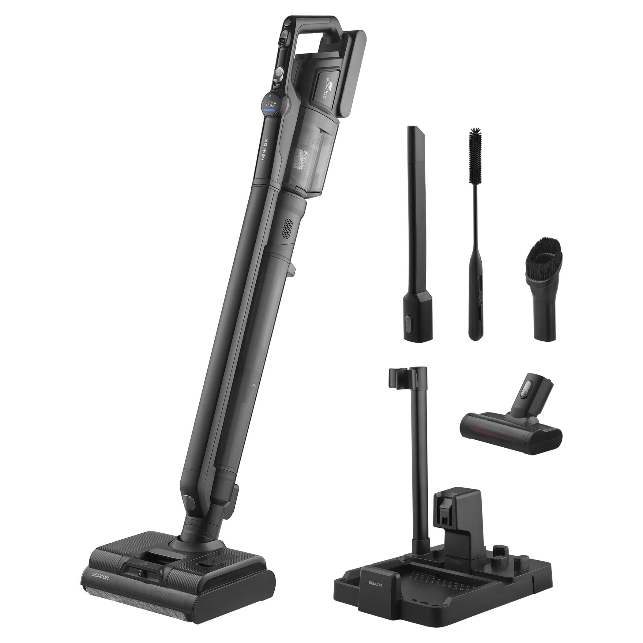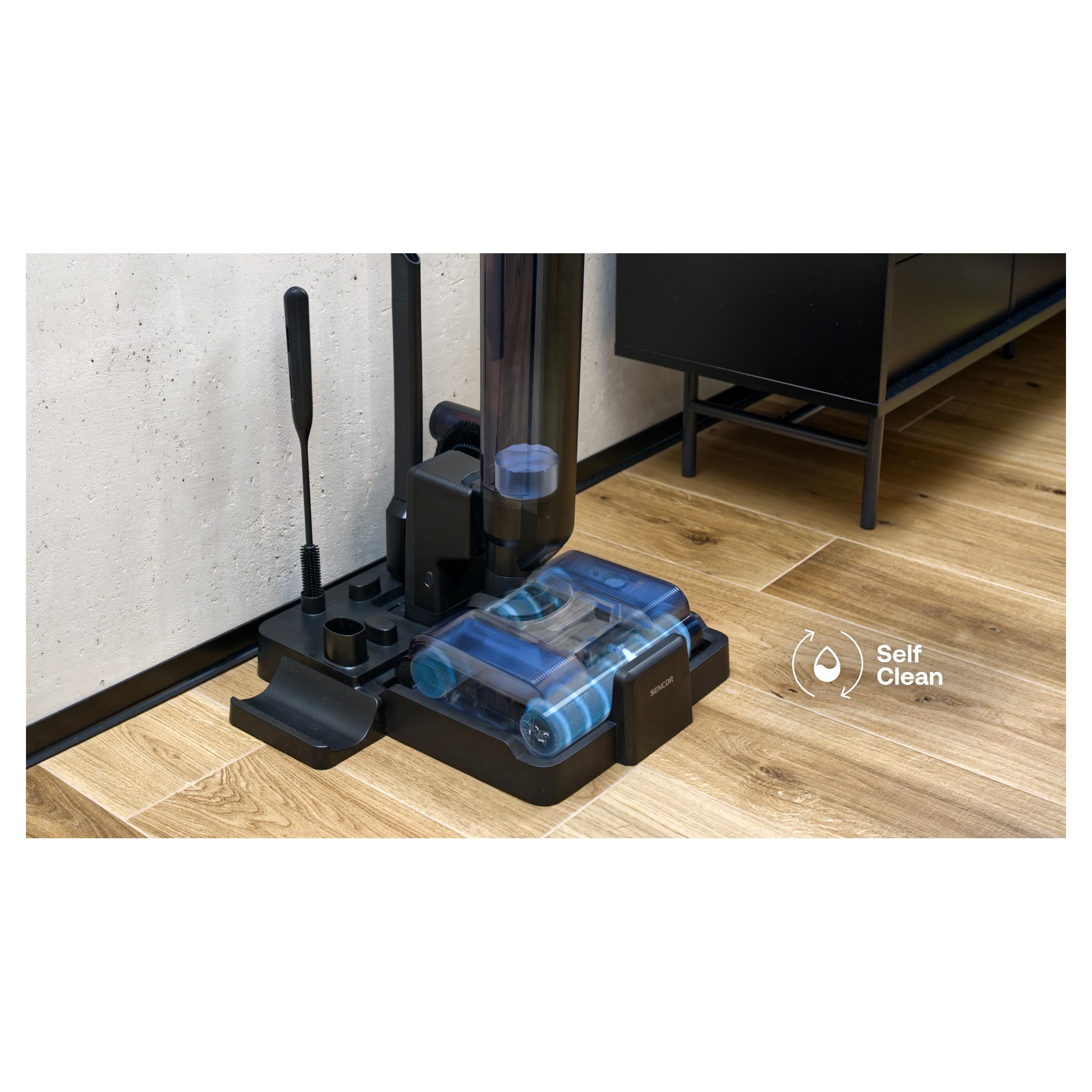 Sencor S88 AQUINO+ został zaprojektowany z myślą o maksymalnej wygodzie. Funkcja Self-Cleaning automatycznie czyści szczotki i przewód odkurzacza, a stacja ładująca nie tylko uzupełnia energię, ale również suszy szczotki gorącym powietrzem. Dzięki temu urządzenie jest zawsze gotowe do pracy, a Ty oszczędzasz czas i wysiłek.