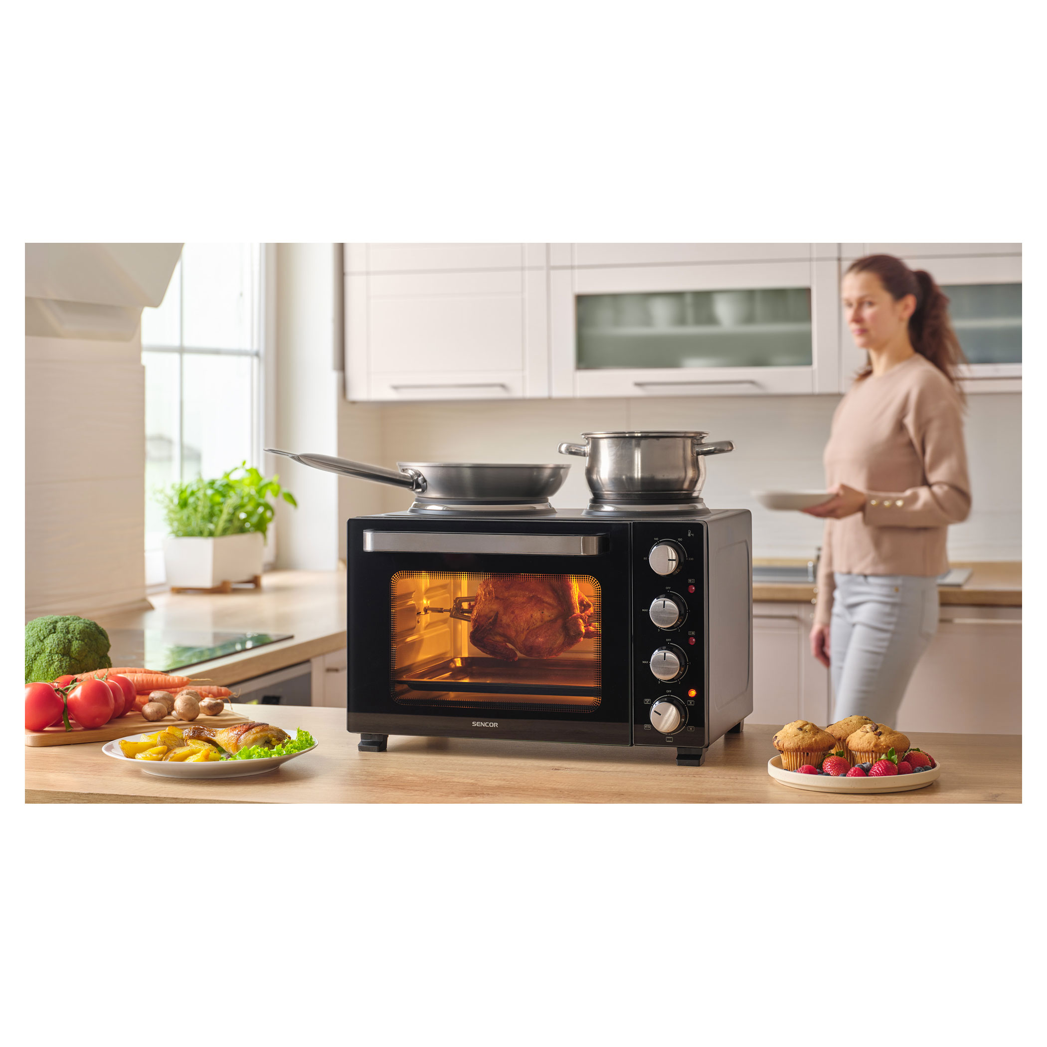 Elektryczny piekarnik z płytami grzejnymi Sencor SEO 2800BK z łatwością poradzi sobie z gotowaniem zup, przygotowywaniem sosów, zapiekaniem makaronów oraz pieczeniem całego kurczaka dzięki całkowitej mocy 3 200 W i pojemności 28 l. Wygodną regulację zapewniają 4 pokrętła obrotowe. O aktualnej pracy płyt grzejnych i piekarnika informują 3 oddzielne kontrolki.