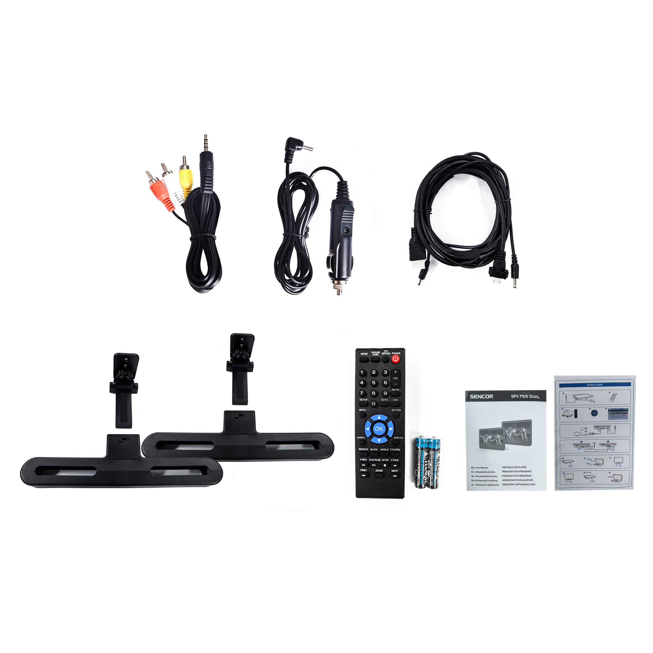 - Akcesoria: ładowarka samochodowa, zasilacz, pilot zdalnego sterowania, bateria, instrukcja obsługi, uchwyt na zagłówek samochodowy *